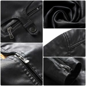 - Fashion stand collar design leather bomber jacket helps you stay away from the cold. A soft fleece inner jacket keeps you warm in cold weather. In addition, the full zip-up closure with 2 slant pockets offers great storage and necessities secure for many items like phones, changes, cards, or keys. The exquisite cuff and hem binding design make this outwear jacket more fashionable and classic.